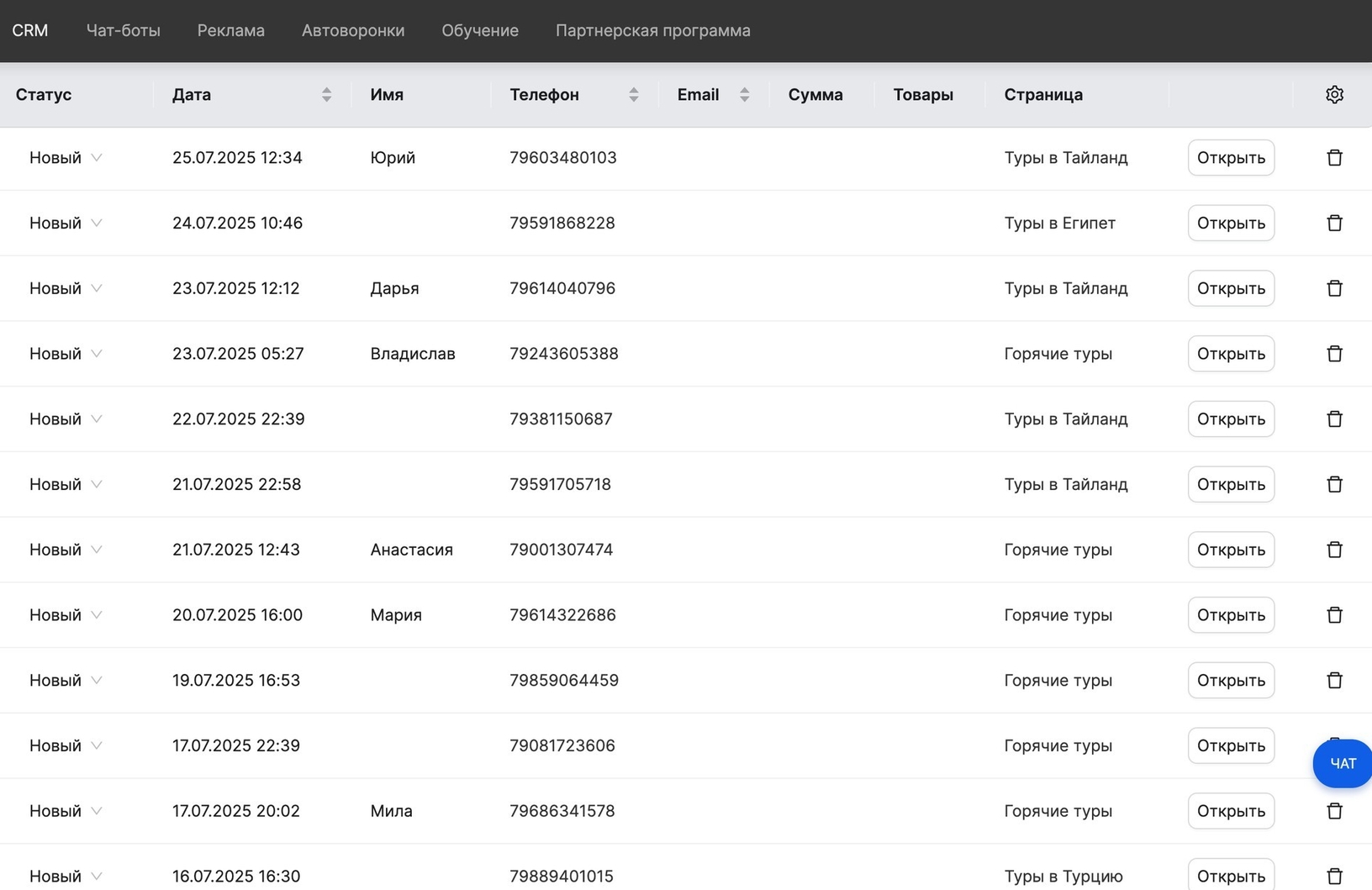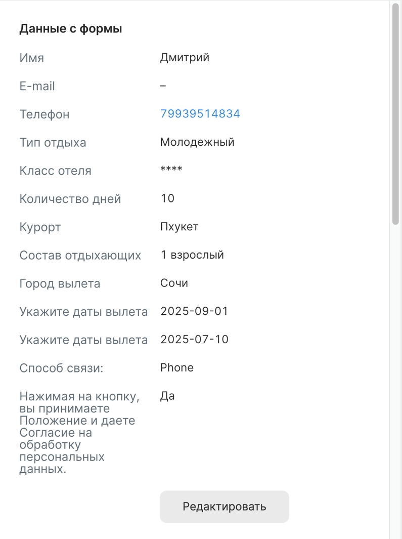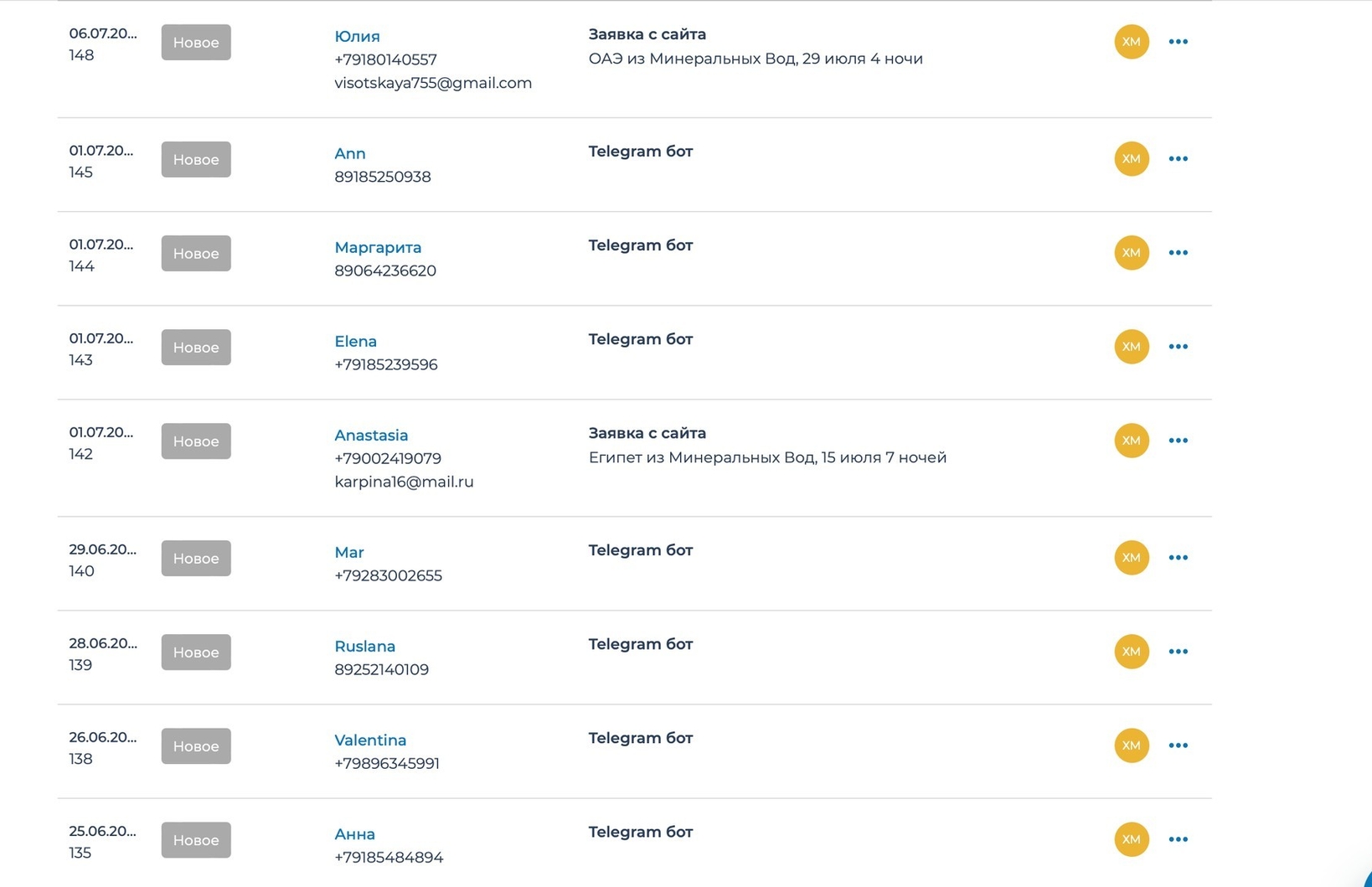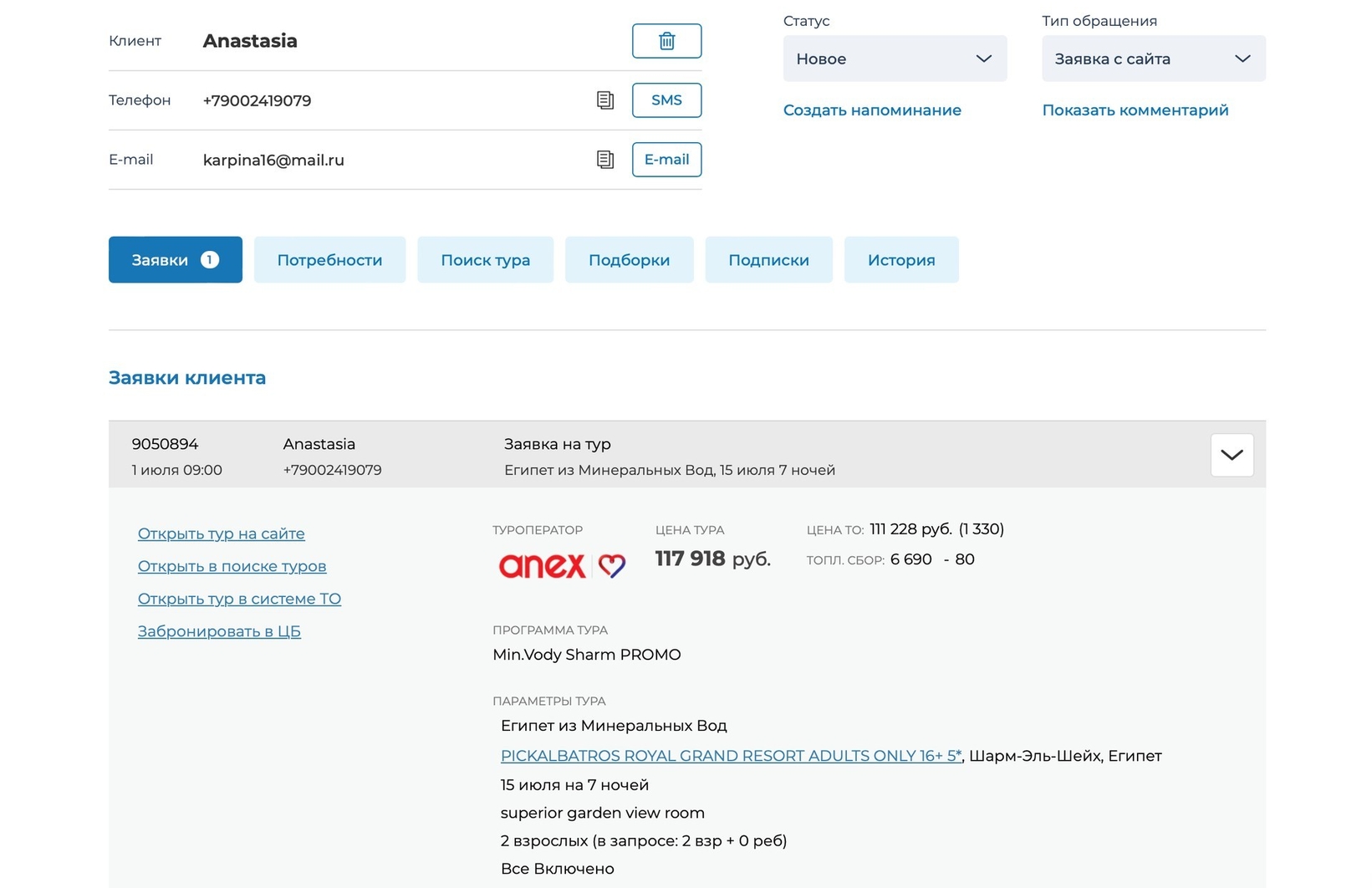 Заявки с форм персональный подбор(квиз-опрос), консультация, подбор тура и др. приходят в CRM систему,