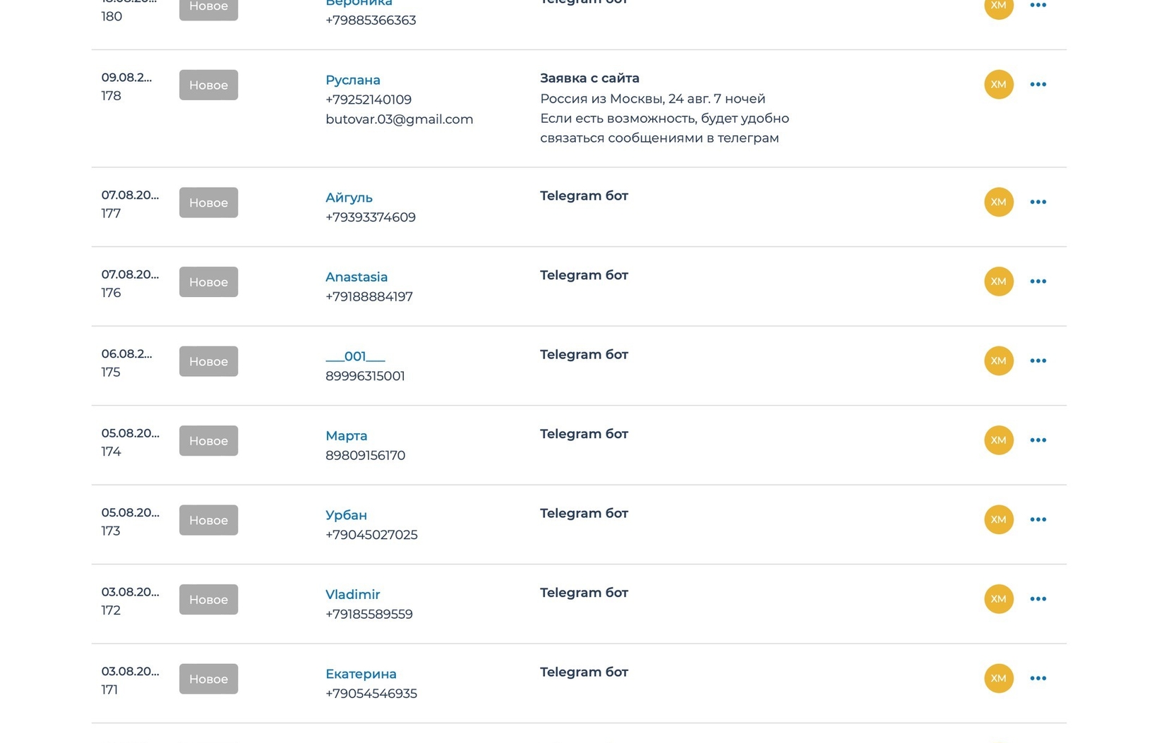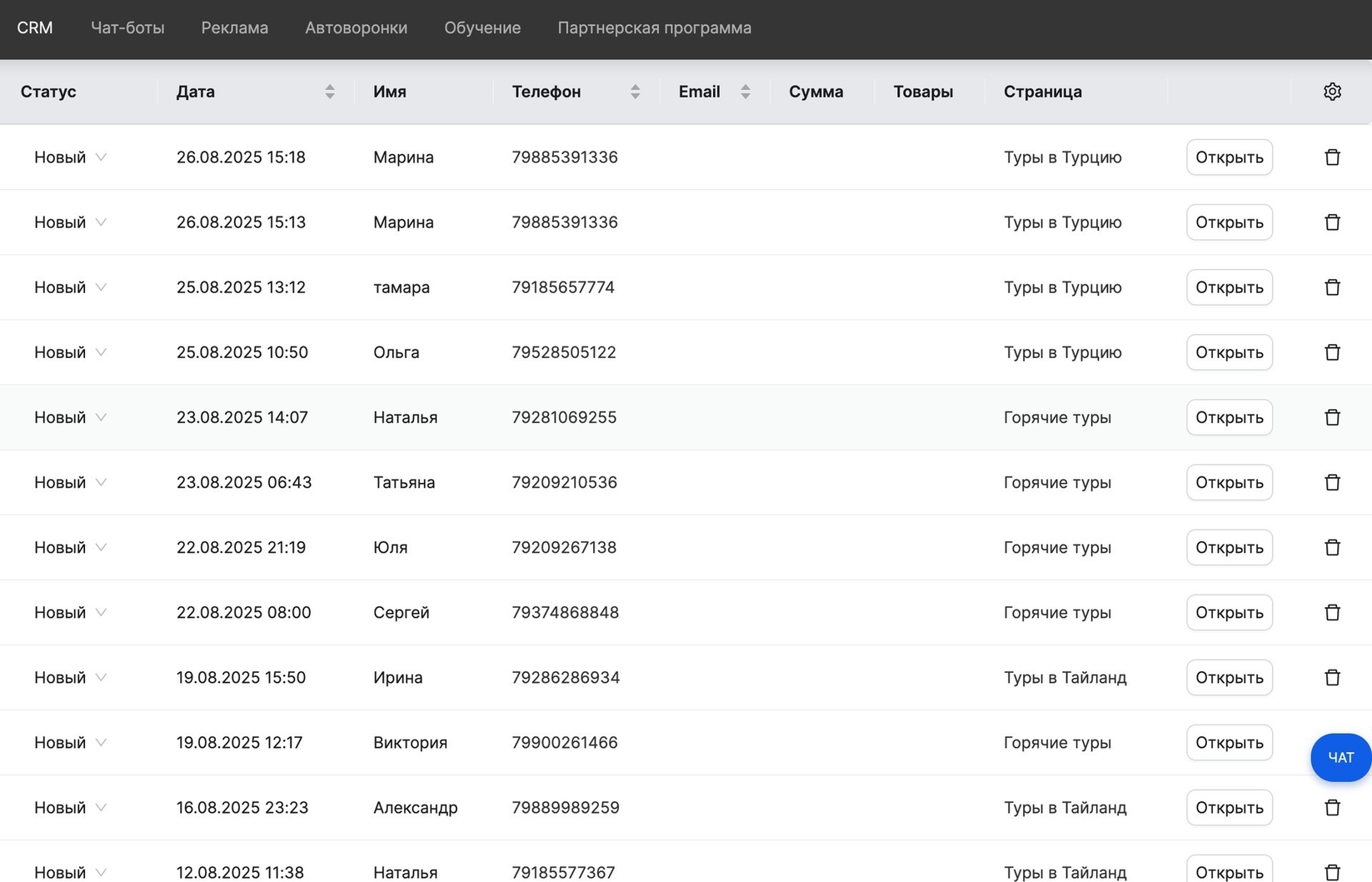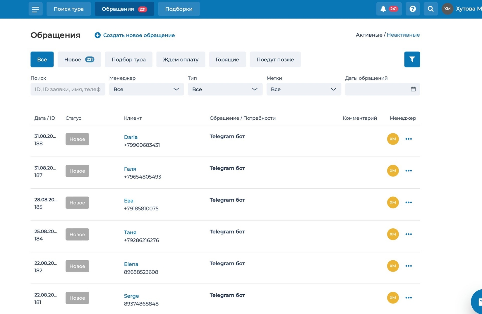 Заявки с форм персональный подбор(квиз-опрос), консультация, подбор тура и др. приходят в CRM систему,