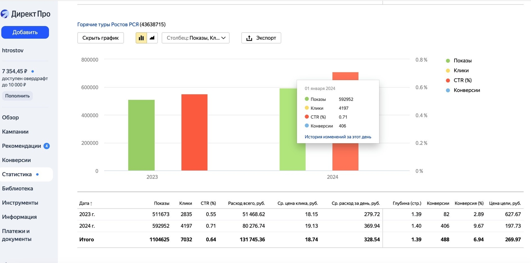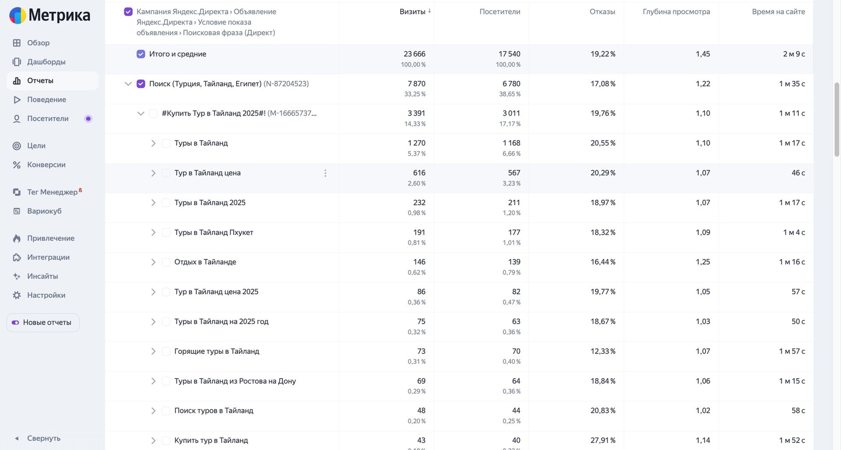 Тестировались разные типы компаний, оптимальным при данном бюджете целесообразно оставить поисковые компании по направлениям туризма.