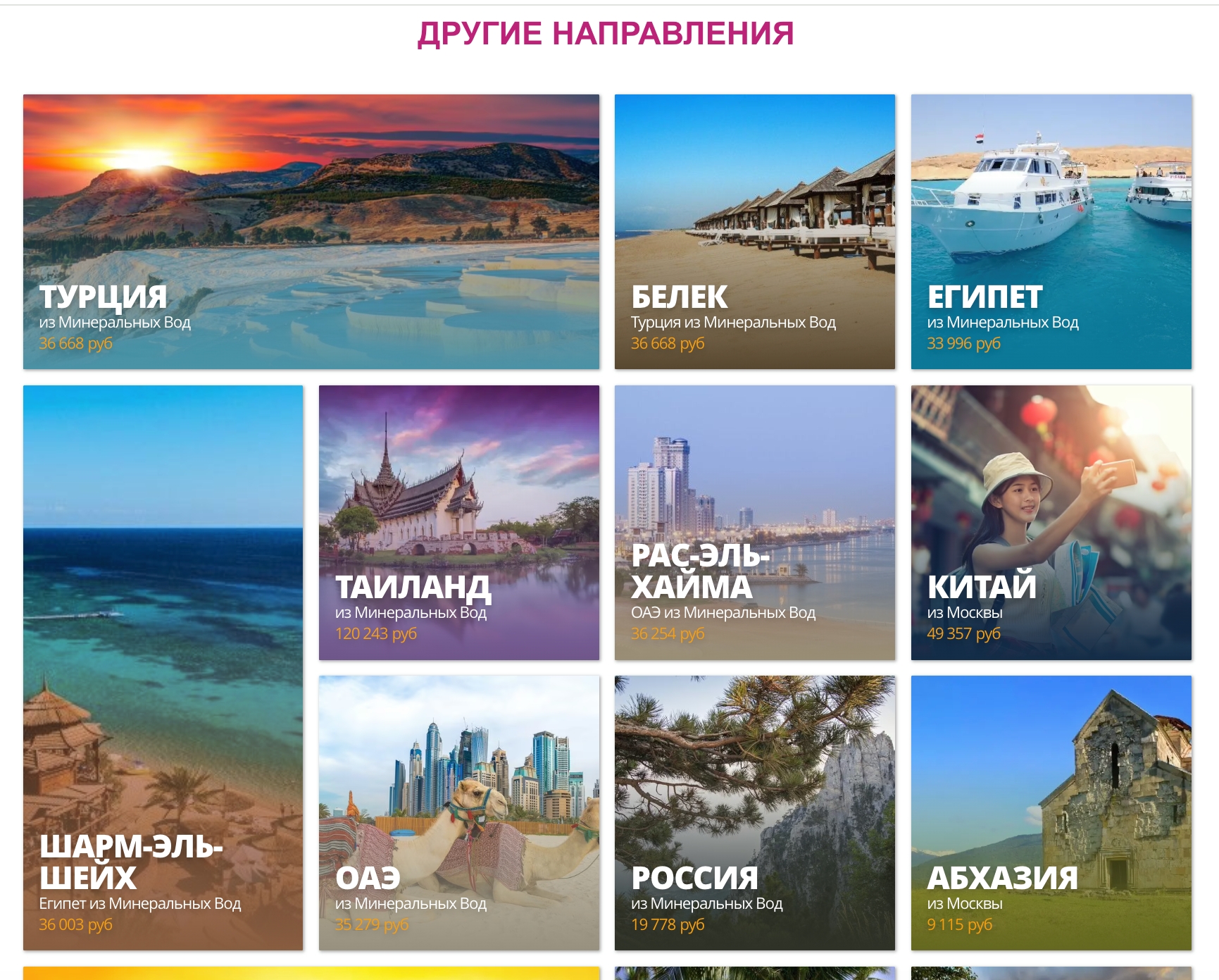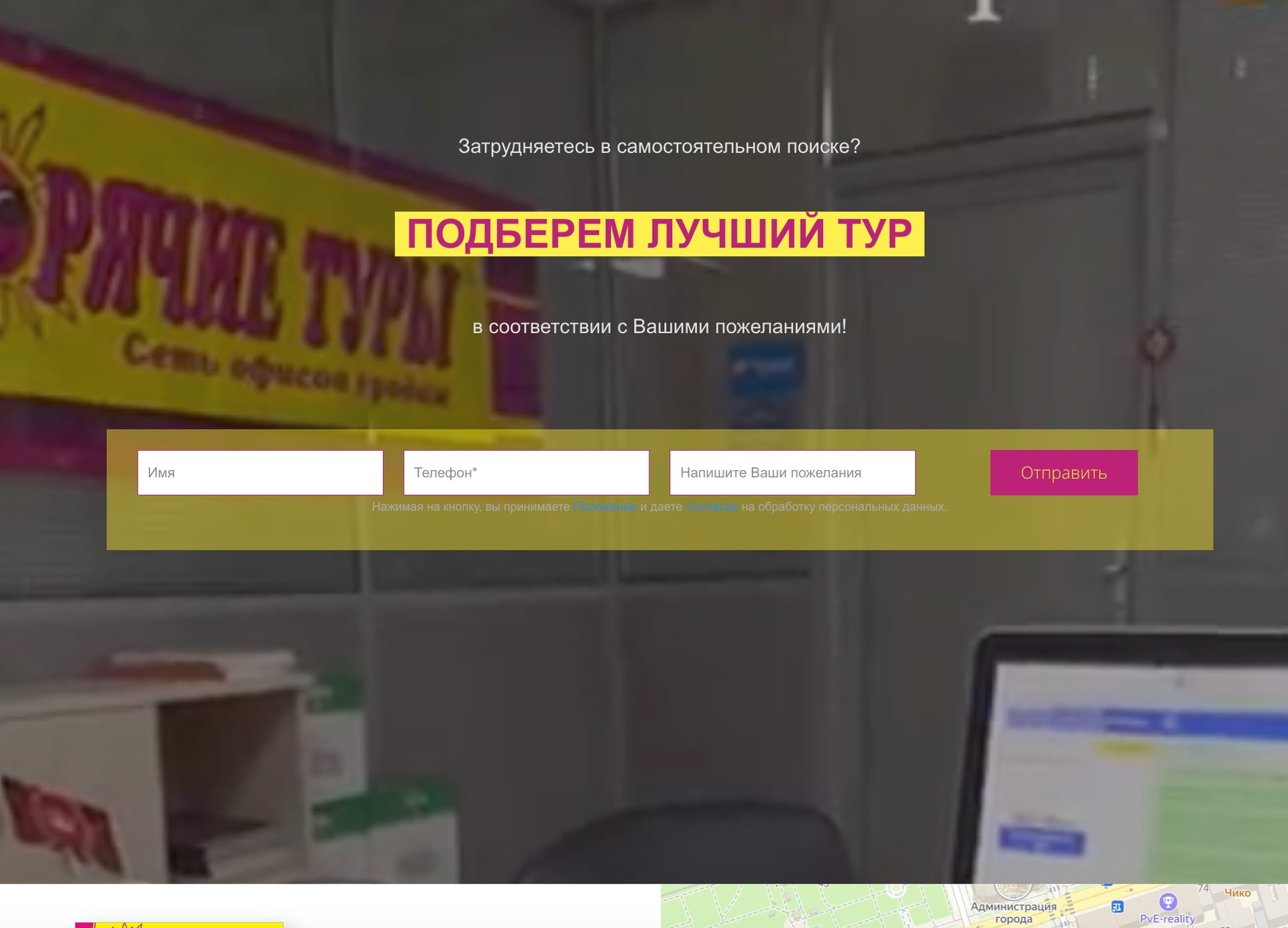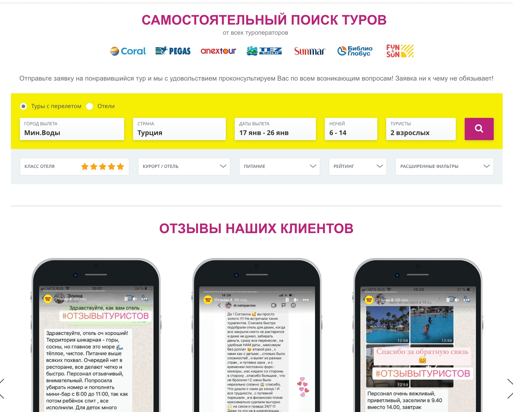 Сайт имеет стандартную продающую структуру, соответствующую специфике ниши пакетных туров и состоит из следующих блоков: