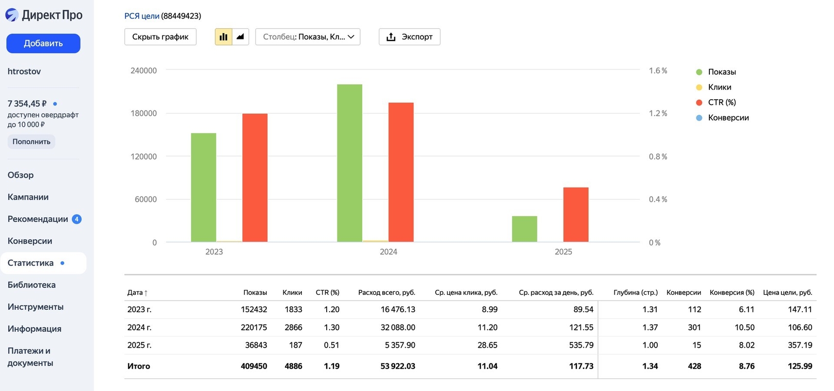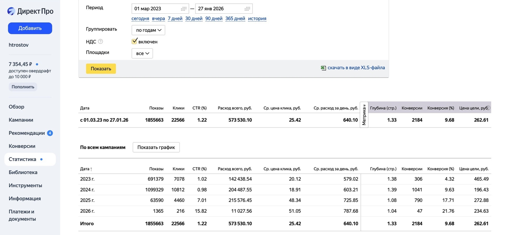 Параллельно была настроена контекстная реклама в Яндекс Директ на основной сайт и на страницы по направлениям.
