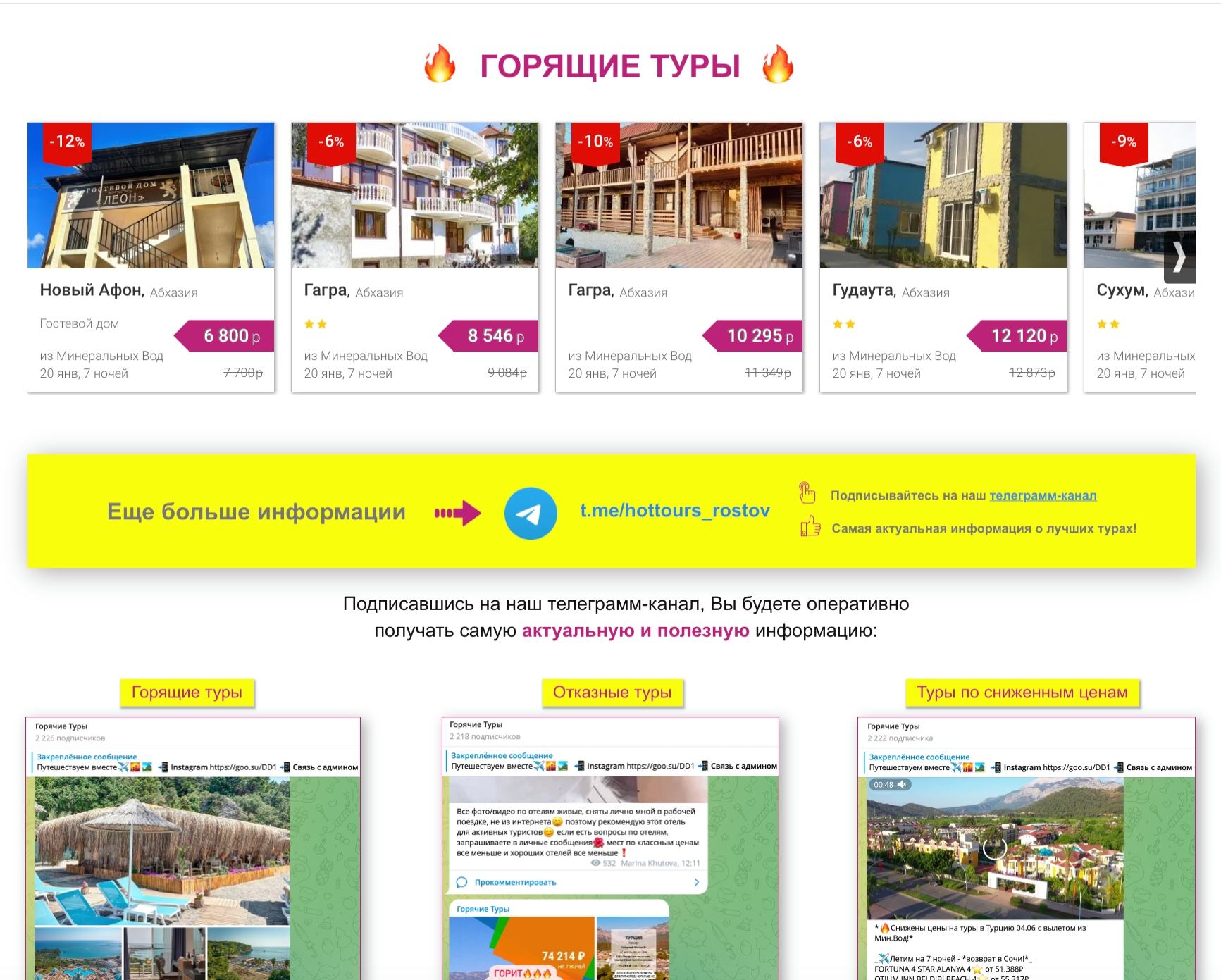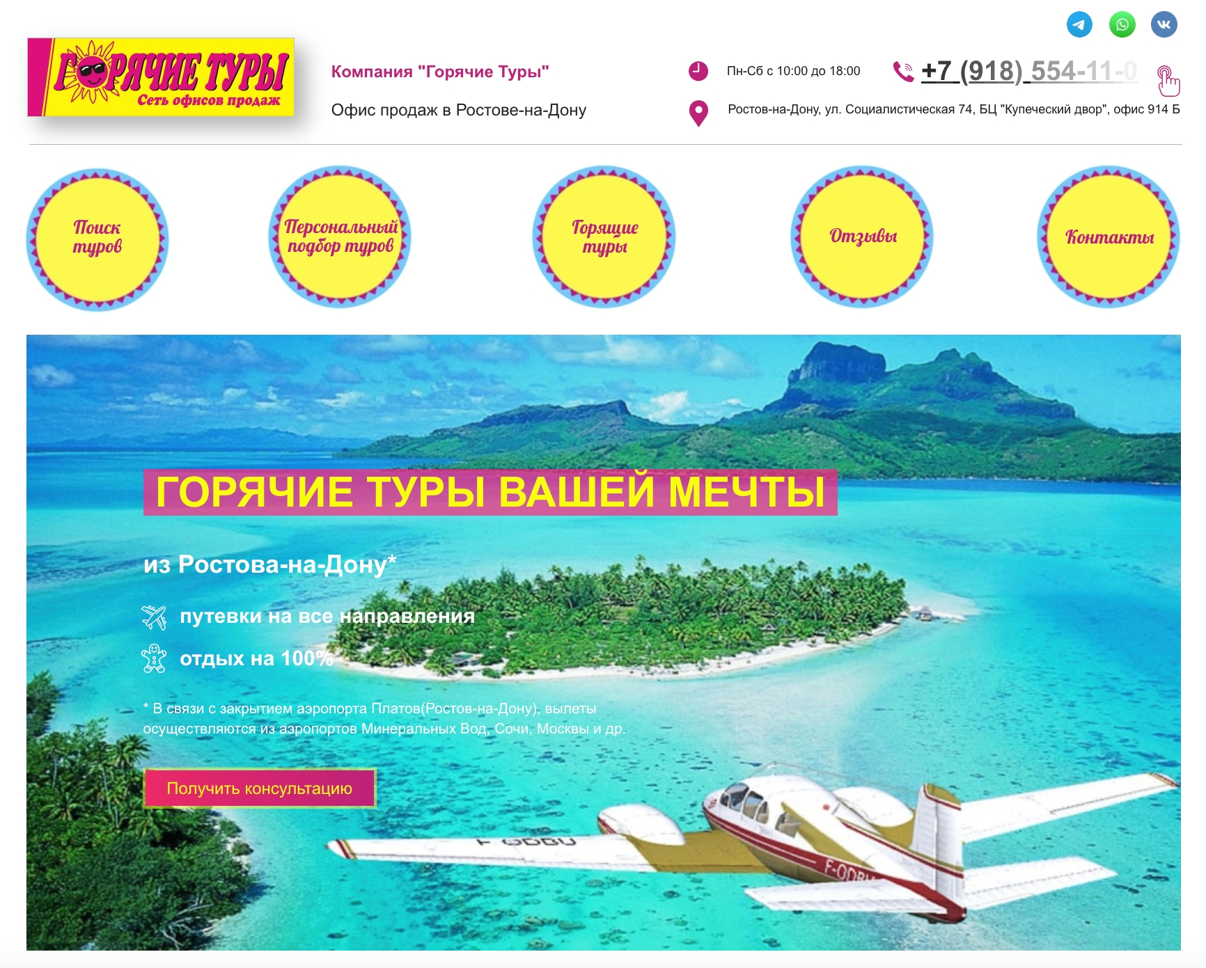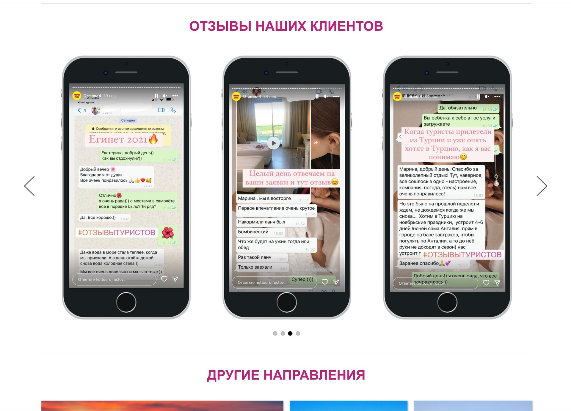 Таким образом, мы создали основную страницу сайта турагентства "Горячие Туры" https://hottours-rostov.ru/ и 3 страницы по наиболее интересным, для турагенства направлениям: Турция, Египет, Тайланд. *запрещён в России, принадлежит компании Meta